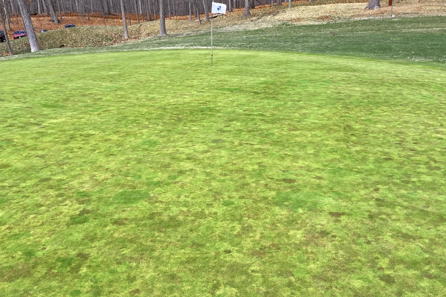 しかし、この時期のグリーンには、少し不思議な光景に気づく方も多いと思います。濃い緑であったり、薄い緑、黄色がかった部分もあり、時には紫色まで混ざり、まるでモザイク柄のように見えることがあります。米国のPGAツアーでもテレビの画面には同じようなモザイク模様が見受けられます。